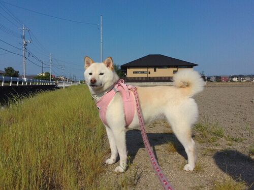 ヒンヤリとしていて気持ちのいい散歩道。 空気もキレイ。 仔犬の頃は何ともなかったのに、今は水辺でちょっと緊張するユメちゃん。 そして水辺から離れるとこの表情。 ウレシイ顔 たのしい顔 公園をぐるっと回って水門に戻ってきました。